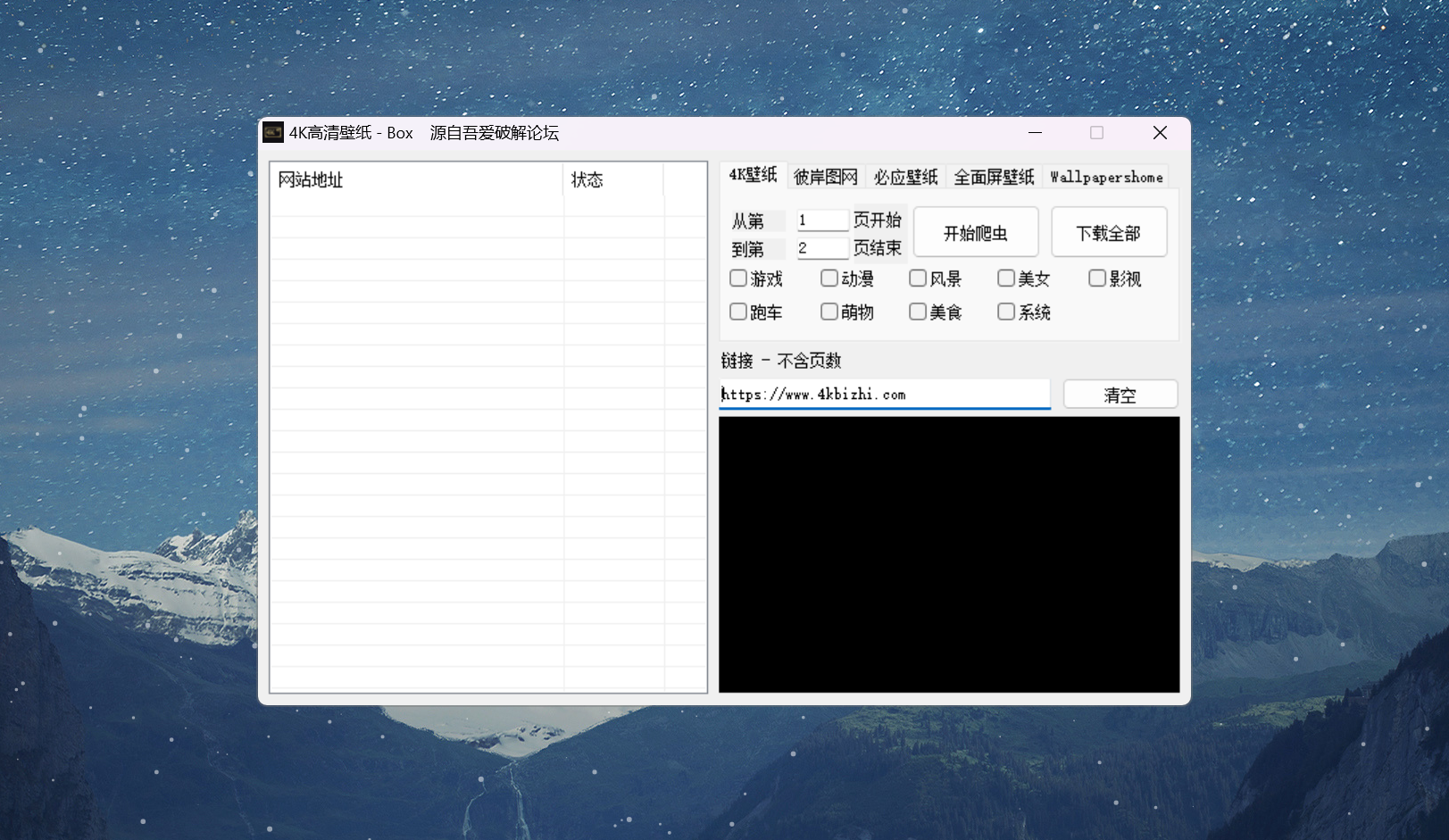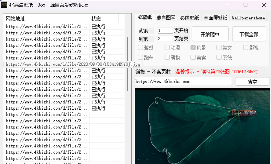 这是一款民间大神自制的壁纸批量下载工具,可以从必应壁纸、4K壁纸、全面屏壁纸等网站中对图片进行批量下载。